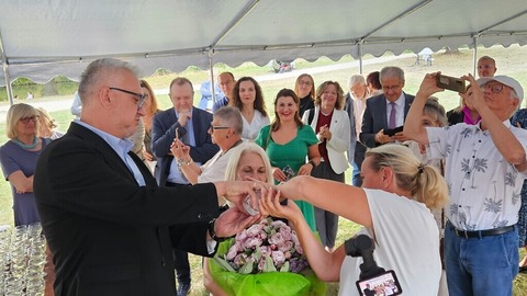 Rosentaufe durch die Forster Bürgermeisterin Simone Taubenek und ihrem Amtskollegen Slawomir Kowal aus Zagan, Fotograf: Diana Priel, Bildrechte: Stadt Forst (Lausitz)/ Diana Priel