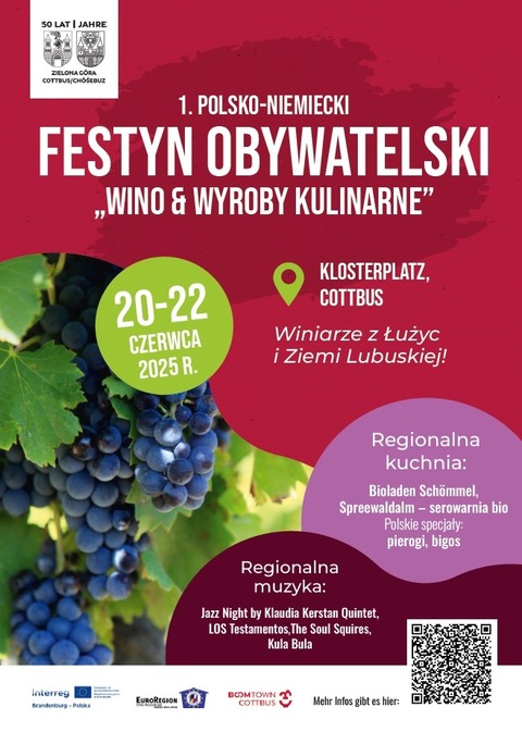 Miasto Cottbus/Chóśebuz z niecierpliwością czeka na wszystkich gości. Wznieśmy wspólnie kieliszki za 50 lat przyjaźni, która nas łączy. Więcej informacji pod kodem QR na plakacie wydarzenia lub bezpośrednio na stronie internetowej miasta Cottbus