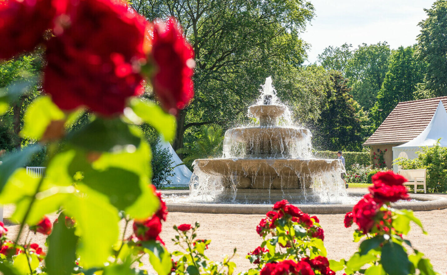 Nehmen Sie Platz im Schatten alter Bäume oder wandeln Sie in einem Meer von Duft und Farben. Genießen Sie eine Pause im Café an den Wasserspielen oder im Restaurant »Rosenflair«.