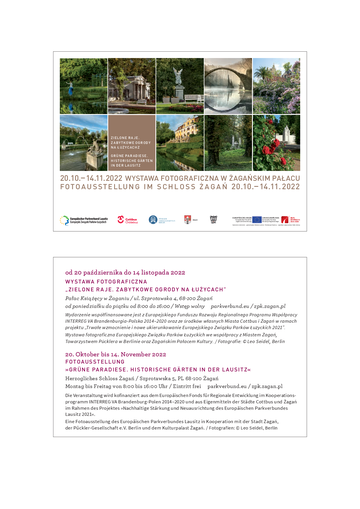 Miasto Cottbus we współpracy z Miastem Żagań oraz Żagańskim Pałacem Kultury zapraszają serdecznie do udziału w polsko-niemieckim wydarzeniu EZPŁ pt. Otwarcie wystawy fotograficznej EZPŁ „Zielone Raje. Zabytkowe Ogrody na Łużycach”.